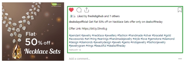 Fill it in with the details of your product. Size, colour, shape and every piece of your viewers would require. These are the important factors that let them finalize whether the piece of jewellery is for them or not. Therefore, let your content be accurate and legible. Let’s not forget the hash tags. If you are new to using Instagram, here is what a hashtag is, “a phrase preceded by a hash sign #, used on Instagram to identify a specific topic”. One of which could go like this #fashionjewellery #jewelleryforwomen and you could take it from there. You could choose a unique hashtag that would be used for your business and its use will trace it back to your profile.